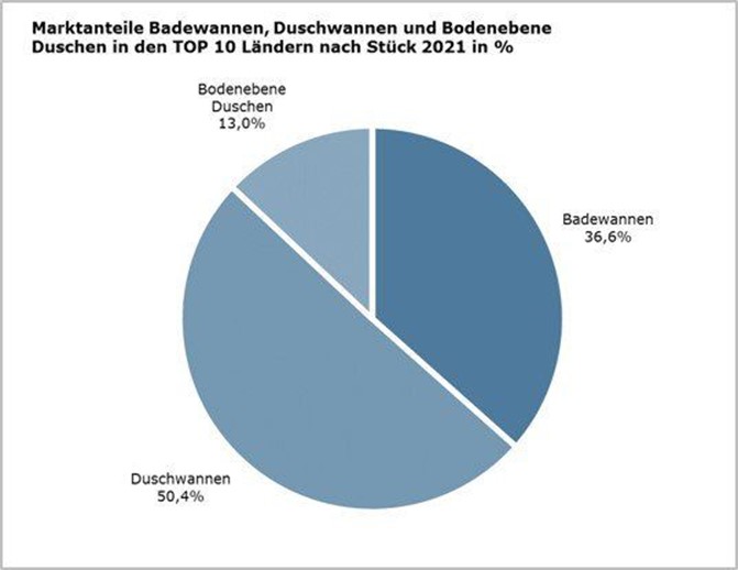 Insgesamt wurden in 2021 in den TOP 10 Ländern mehr als 12 Millionen Badewannen, Duschwannen und Bodenebene Duschen verkauft. Die Inlandsmarktversorgung der TOP 10 Länder liegt bei über 2,6 Milliarden in diesem Zeitraum.