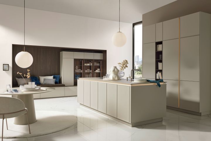 Naturtöne finden sich aber nicht nur in den Japandi inspirierten Küchen: 2026 wird eine warme, naturinspirierte Farb-Palette dominieren: Sand, Macchiato, Coffee, Taupe‑ und Greige‑Abstufungen. Sie beruhigen große Flächen, lassen Räume weicher wirken und funktionieren als verbindendes Element zwischen den verschiedenen Wohnzonen. „Die großen Farbräume sind warm, gedeckt und fein nuanciert“, sagt Volker Irle von der AMK. „Sie machen offene Grundrisse leiser und lassen Materialien besser altern.“ Explizit ausgewiesen werden diese Nuancen als Top‑Farben in den Neuheitenprogrammen der Hersteller – inklusive strukturierter Einstiegsfronten und Premium‑Mattlacken. Auch überarbeitete Mattlack‑Welten samt Anti‑Fingerprint‑Optimierungen zahlen auf den Trend ein. Parallel wird „Natürlichkeit & Minimalismus“ als übergreifendes Leitmotiv kommuniziert – „das Zuhause als Ort des Wohlbefindens“. Gesellschaftlich passt das zum Naturbezug und zur Erdverbundenheit, die einen Gegenpol zur Reizüberflutung der modernen, digitalen Welt bildet.
