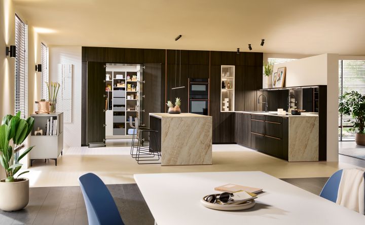 Arbeitsplatten, Rückwände und selbst ganze Kücheninseln in Naturstein-Optik verleihen dem Raum eine zeitlose Eleganz. Besonders gefragt sind Marmor, Schiefer und Granit in warmen, erdigen Farbtönen. Solche Oberflächen sind langlebig, pflegeleicht und zugleich äußerst stilvoll. In Kombination mit Holz und matten Oberflächen entsteht so eine moderne und dennoch gemütliche Atmosphäre, die Naturverbundenheit und luxuriöses Design perfekt vereint. Die Fachmessen zeigten hierzu Kücheninseln mit nahezu fugenloser Steinverkleidung als imposante Blickfänger – ein Trend, der die ursprüngliche Kraft des Naturmaterials ins Zentrum moderner Küchen rückt.