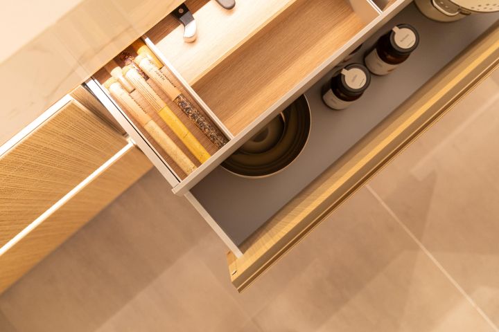 Weil Wohnraum in Großstädten knapp und teuer ist, zählt clevere Kapazität. Daten zeigen: Zwar wuchs die durchschnittliche Wohnfläche je Person auf 49,2 m² (Deutschland, Ende 2024), doch die Ballungsräume bleiben angespannt – kleinere Haushalte, höhere Mieten, begrenzte Grundrisse. Die Antwort aus der Küchenplanung: neue Standardtiefen (z. B. 61 cm) für mehr Nutzvolumen, extrem dünne Zargen (≈ 8 mm) für zusätzliche Innenbreite sowie serienmäßige Auszugsbeleuchtung, die Übersicht und Wertwahrnehmung steigert. „Ein Zentimeter in der Tiefe wirkt klein – in Summe sind das viele Liter und ein subjektiv deutlich größerer Stauraum“, so Volker Irle. „Und Licht im Auszug übersetzt sich 1:1 in Komfort und Kaufargumente.