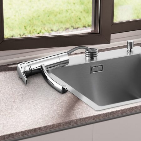 Die Ergonomiearmatur „Mio“ und die Fensterarmatur „Fuoco“ sind formvollendet gestaltet und überaus clever im Gebrauch. „Mio“ bietet alles, was Kunden von einer ergonomischen Armatur erwarten: Hohen Bedienkomfort durch seitlichen Hebel und schwenkbaren Auslauf mit oder ohne Laminarstrahlregler, eine zeitgemäße Farbauswahl zwischen chrom, schwarz matt und edelstahlfinish, optional eine ausziehbare Schlauchbrause oder ein flexibler Silikonschlauch sowie eine Niederdruckversion für den Anschluss an offene Heißwassergeräte. „Fuoco“ folgt dem Trend zu schlankerem Armaturendesign. Mit einem Handgriff lässt sie sich als Fensterarmatur herausziehen und umklappen. Damit stehen „Mio“ und „Fuoco“ stets im Mittelpunkt: attraktive Aufmerksamkeitsmagneten am Spülzentrum.