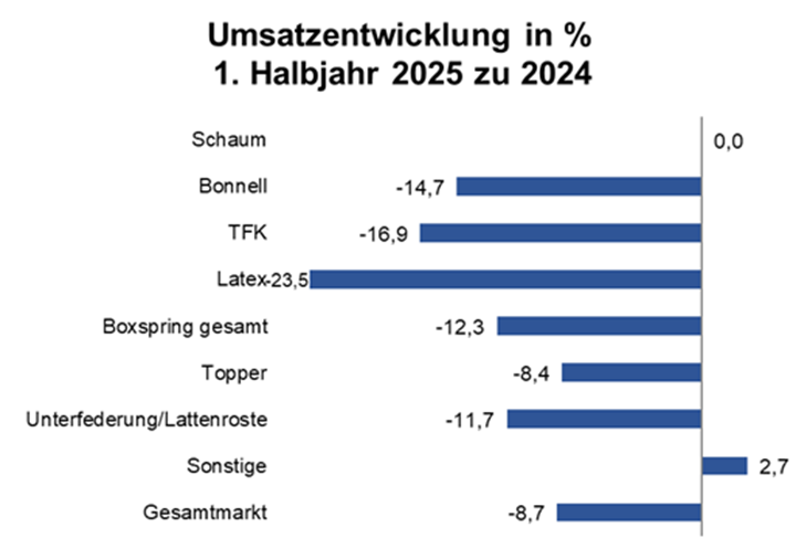 Die Matratzenhersteller haben für das 1. Halbjahr 2025 einen Umsatzverlust von -8,7 % zu beklagen, beim Absatz wurde ein leichtes Plus von 2,4 % erzielt. Dennoch ist die Kaufzurückhaltung bei fast allen Technologien und Warengruppen erkennbar. Einzig Schaum (+11,9 % Absatz, Umsatz +/- 0) und Sonstige (+23,6 % Absatz, +2,7 % Umsatz) haben sich positiv entwickelt. Mit jeweils rund einem Viertel Rückgang bei Absatz und Umsatz ist Latex größter Verlierer. TFK (-10 % Absatz, -16,9 % Umsatz) mit weniger Verlusten als Einstiegsprodukt Bonnell. Bei den Warengruppen haben Unterfederungen und Boxspring mit -16 % (Absatz) und -12 % (Umsatz) ähnlich hohe Verluste zu beklagen.