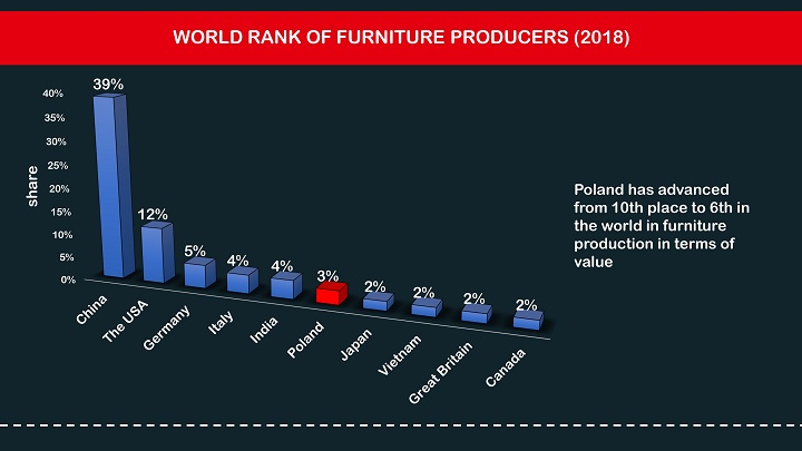 Die Möbelindustrie ist der am schnellsten wachsende Sektor der polnischen Wirtschaft, der global geworden ist. Hochwertige Möbel, immer noch relativ niedrige Arbeitskosten und eine perfekte geografische Lage unterstützen die gute Position. Polen gehört zu den führenden Möbelherstellern in Produktion und Export, was die folgenden Zahlen bestätigen: