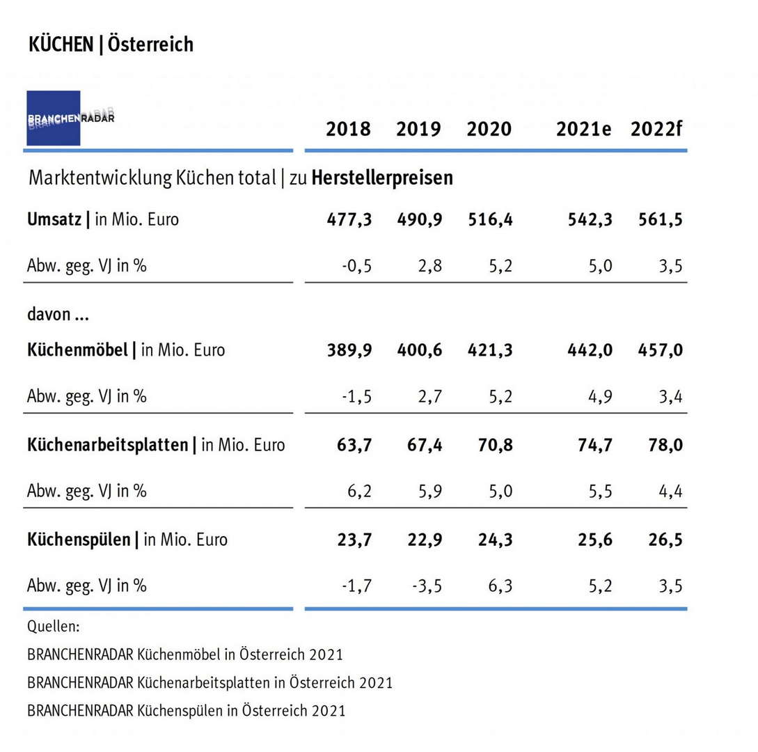 Allerdings zogen im Jahr 2020 die Preise kräftig an. Im Durchschnitt lag der Preisauftrieb bei vier Prozent. Denn in der Erwartung eines regen Ersatzgeschäftes erhöhten die Anbieter die Preise signifikant, wobei da und dort die Kosten der Pandemie (sinkende Produktivität durch Lieferverzögerungen, Abstandsregeln usw.) auch gleich eingepreist wurden. Infolge erhöhten sich die Herstellererlöse mit Küchen (ohne Haushaltsgeräte) insgesamt um 5,2 Prozent gegenüber Vorjahr auf 516,4 Millionen Euro. Davon entfielen 421,3 Millionen Euro auf Küchenmöbel, 70,8 Millionen Euro auf Küchenarbeitsplatten und 24,3 Millionen Euro auf Küchenspülen.