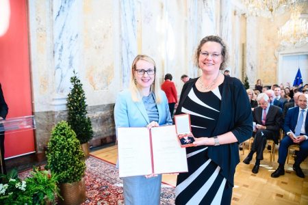 Margarete Schramböck überreicht das Silberne Ehrenzeichen an Sandra Kolleth