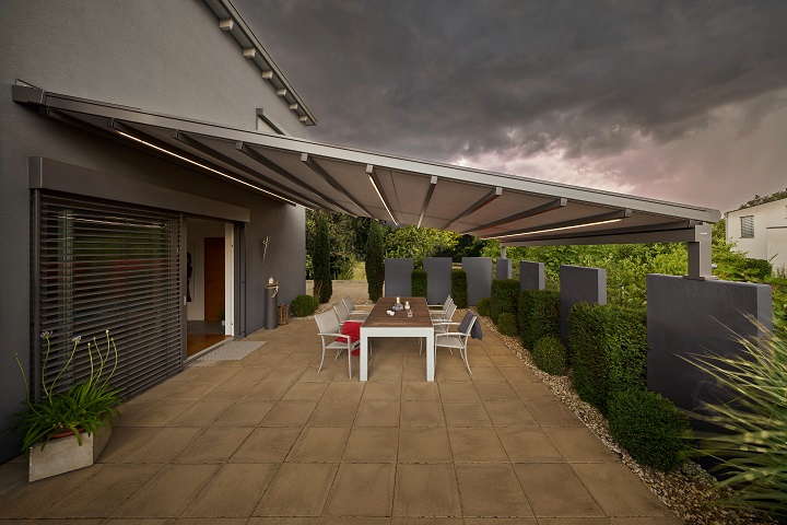 . Für Terrassen, die öfter starken Winden ausgesetzt sind, eignen sich wetterfeste, smart gesteuerte Perea Pergola-Markisen zur Verschattung, die dank secudrive® System eine sehr gute Tuchspannung besitzen und aufgrund der stabilen Pfosten auch kräftige Böen problemlos überstehen.